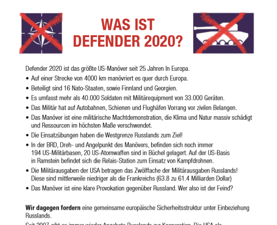 Jede Unterstützung hilft uns, das Nato Kriegsmanöver Defender 2020 weiter ins öffentliche Bewusstsein zu bringen.